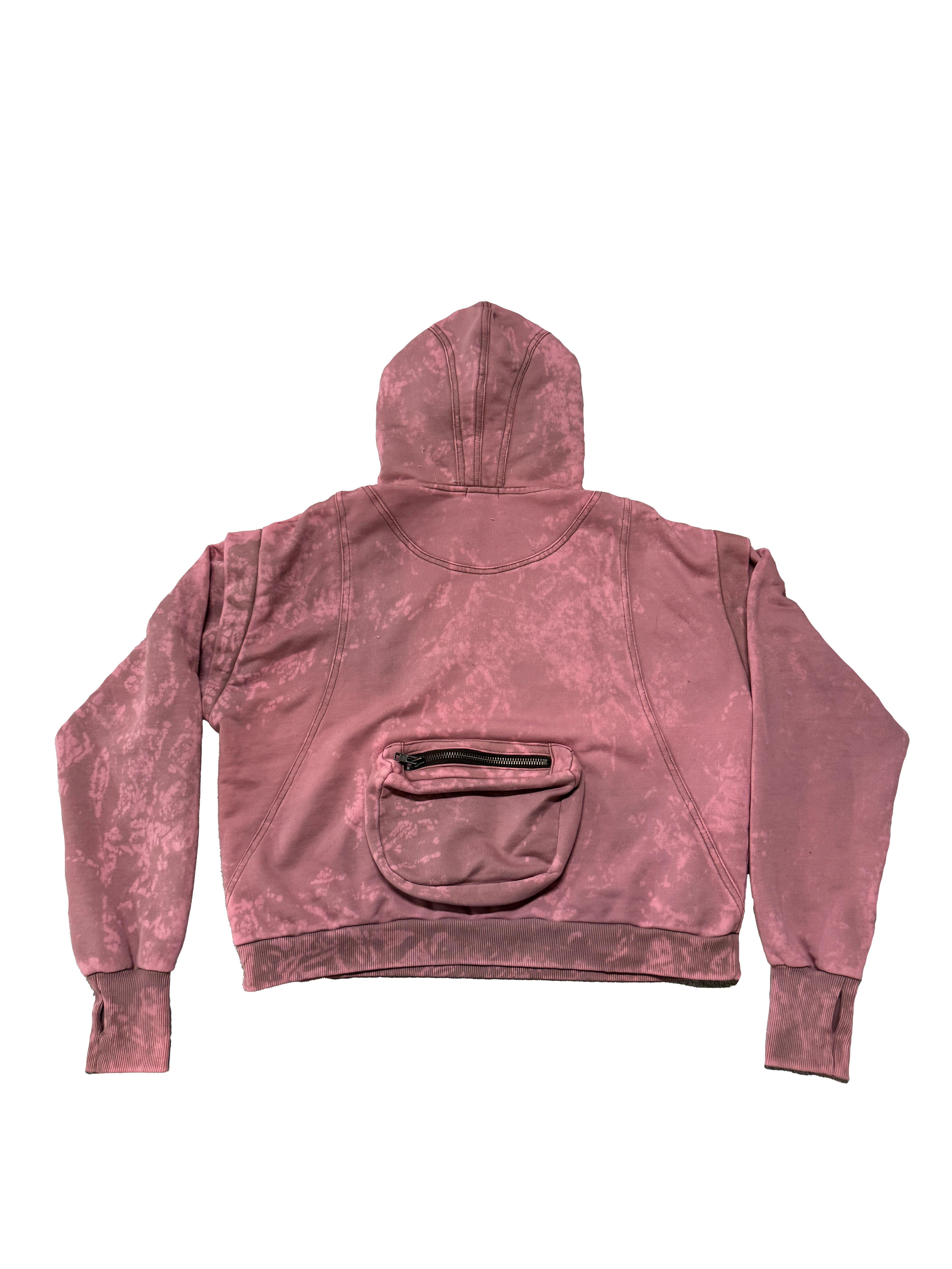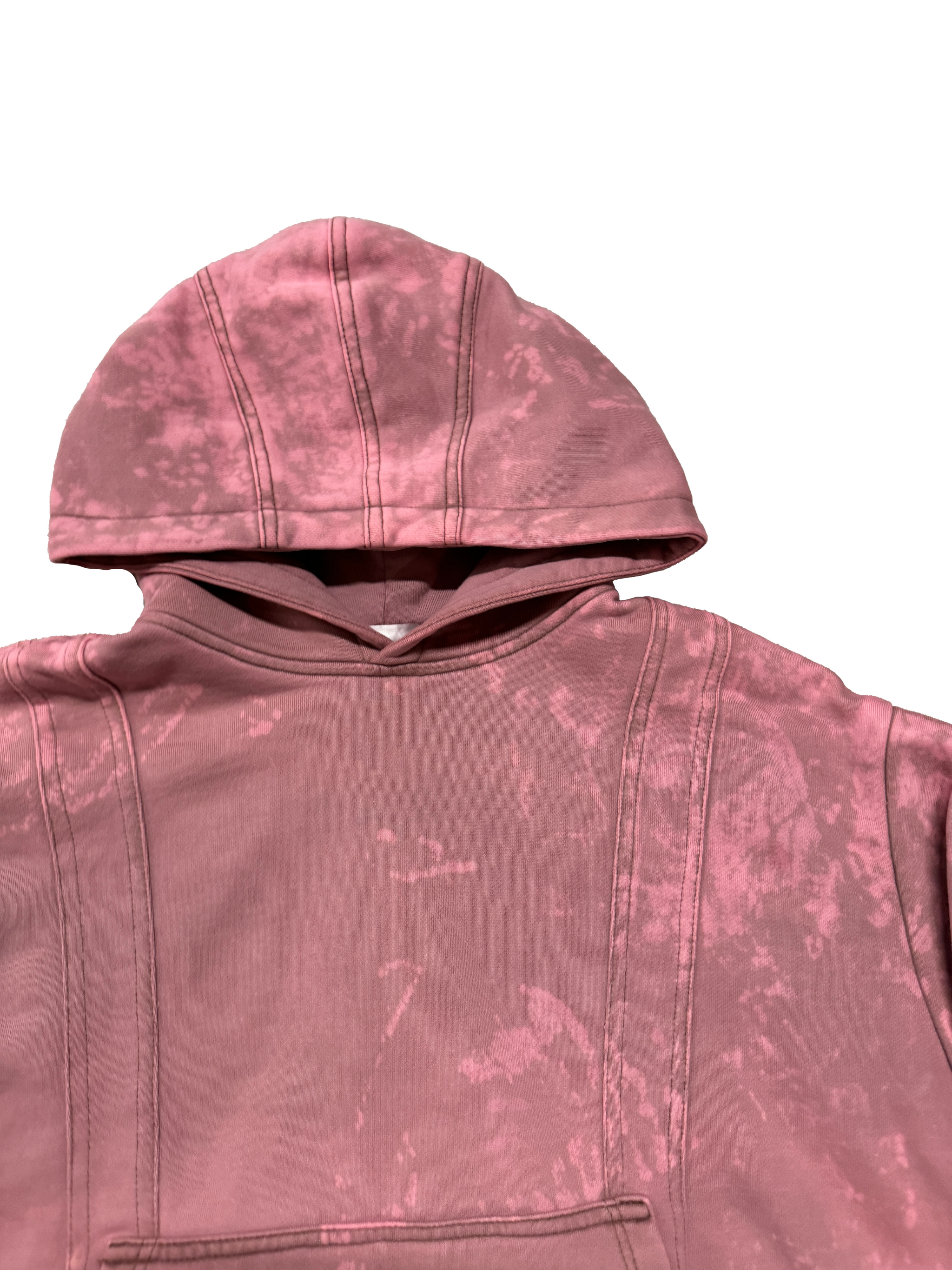 - Layered elements on the hood, front, and back of the hoodie